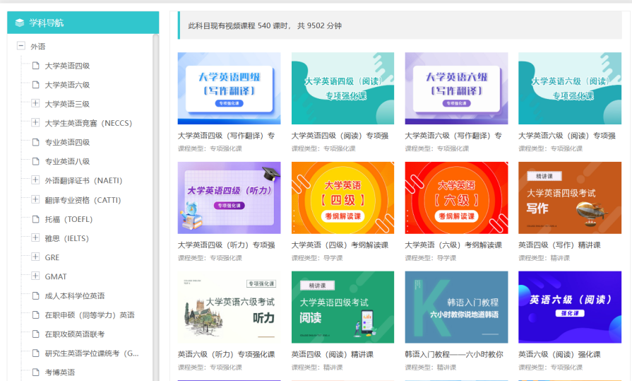 外语类目下已收录视频课程540课时。包含大学英语四级、大学英语六级、托福、雅思等考试视频课程。