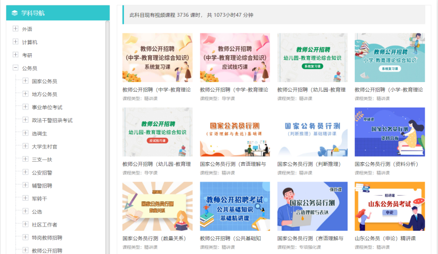 公务员类目下已收录视频课程3736课时。包含国家公务员、地方公务员、事业单位考试等考试视频课程。
