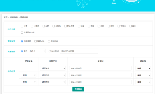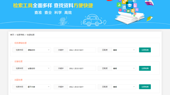 VIPExam考试库提供快速检索、标准检索、高级检索、学科导航检索、名师导航检索五种检索工具,同学们可以从输入专辑、资源类型、发布时间、课程名称、课程类型、章节名称、主讲教师等十余项检索字段,从而精准搜索出所需视频和试卷。