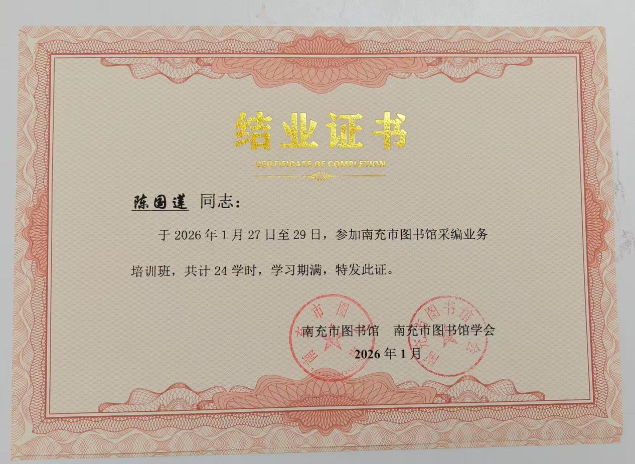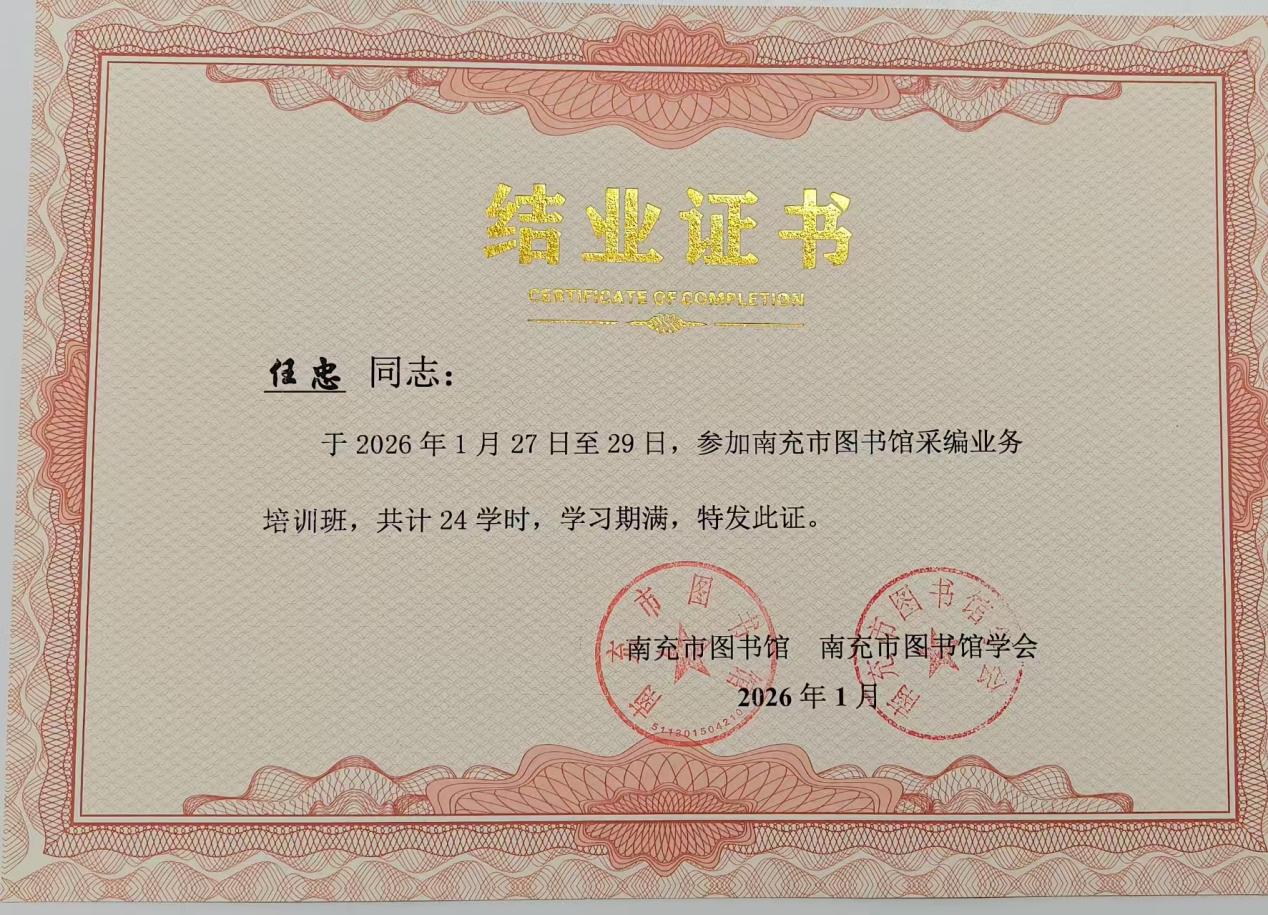 为提升业务能力,我校图书馆馆员陈国莲、任忠于2026年1月27日至29日,参加了由南充市图书馆及市图书馆学会举办的“2026年图书采编业务培训班”。